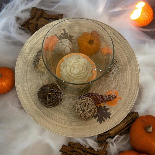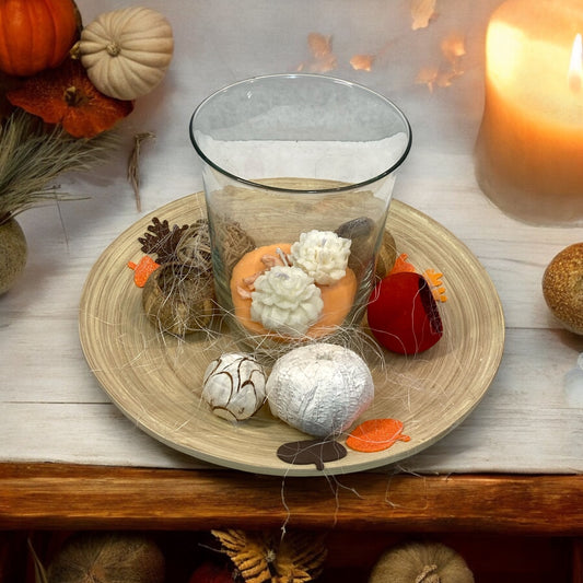 Prezzo scontato €0,00Centrotavola autunnale composto da piatto in legno con decorazioni autunnali e vaso... -