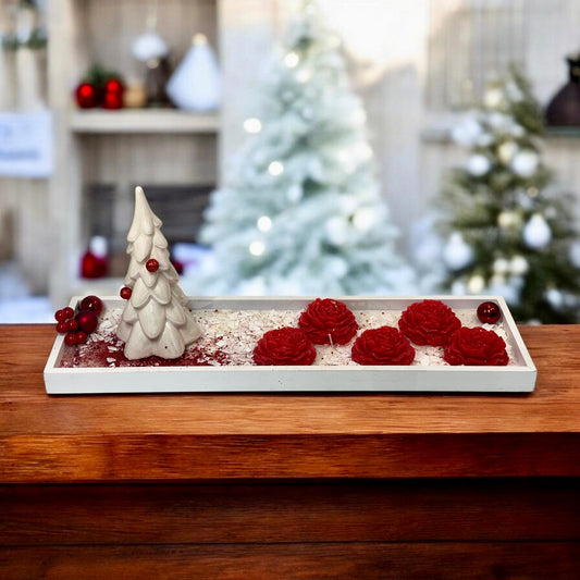 Prezzo scontato €0,00Centrotavola natalizio, composto da vassoio in legno color bianco, base di cera...