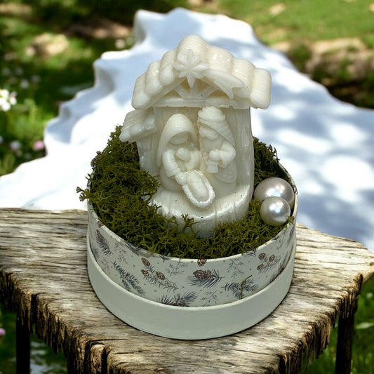 Prezzo scontato €0,00Mini presepe in cera di soia naturale posizionato all’interno di scatolina natalizia,... -